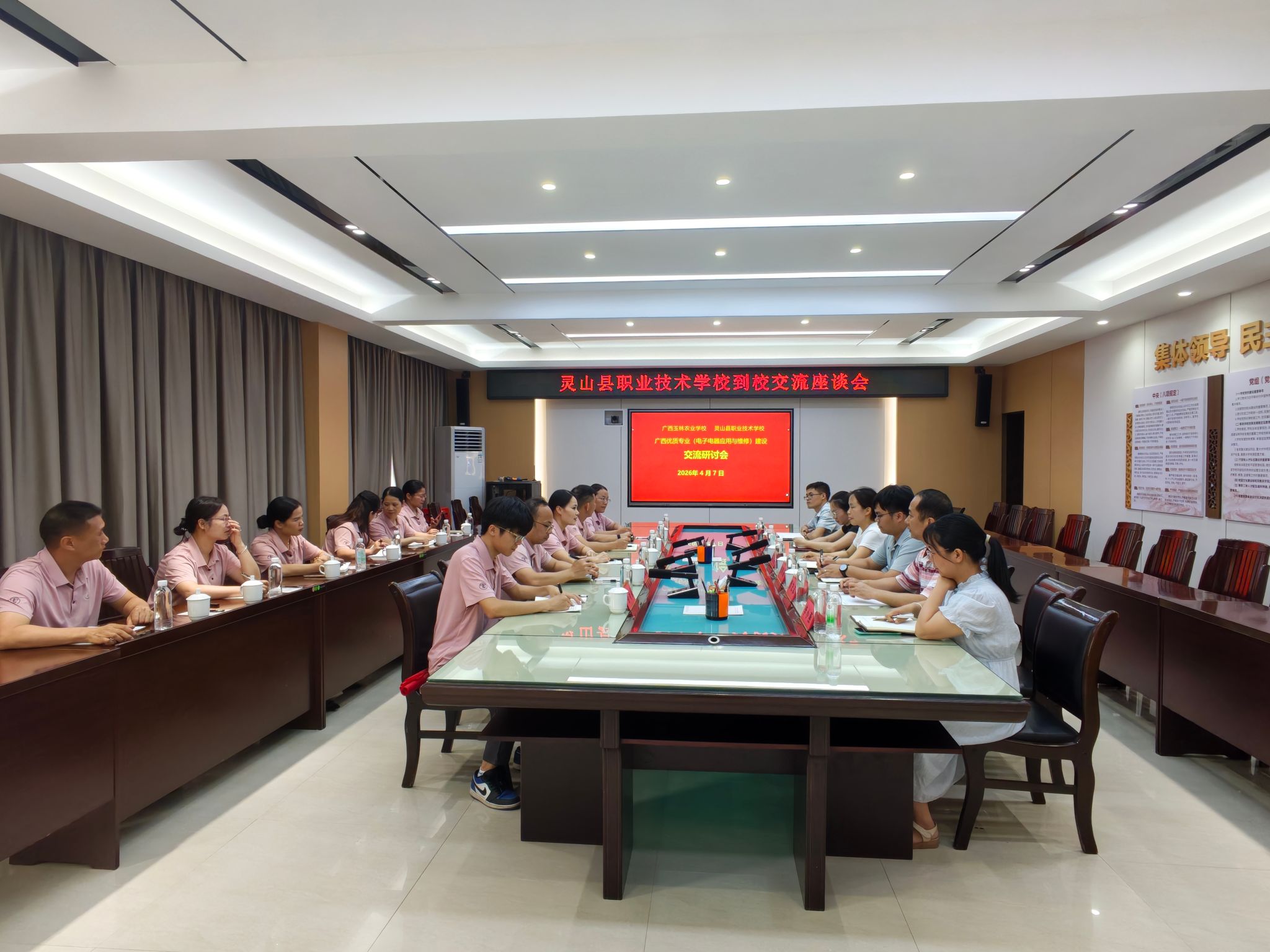 (通讯员 钟译漩)4月7日下午,灵山县职业技术学校教研处副主任带队一行11人到我校开展专业建设交流活动。我校教务科副科长郑夏燕、交通运输科副科长姚明泉以及电子电器应用与维修专业骨干教师热情接待,在学校勤勉楼三楼行政会议室开展座谈会。