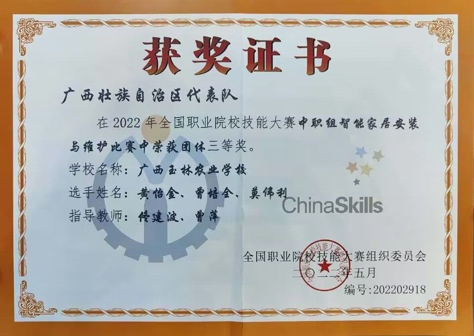 全国职业院校技能大赛中职组“智能家居安装与维护”比赛荣获团队二等奖